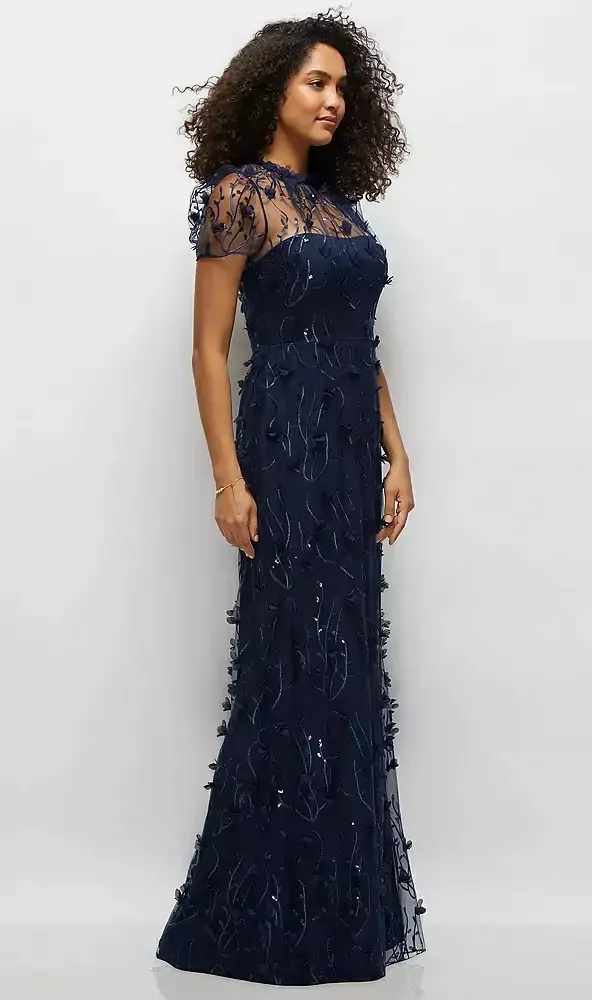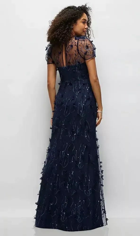 This dreamy maxi dress is all about ethereal vibes! It's got a classic A-line silhouette with a smooth strapless bodice underneath a layer of sheer magic. The overlay is a garden of 3D floral embroidery that looks straight out of a fairytale. Adding a dash of drama are the illusion puff sleeves and gathered, shirred neckline sprinkled with hand-placed delicate petals—like a necklace of flowers. The A-line skirt keeps it sleek and flowy, making sure you look effortlessly chic from every angle.