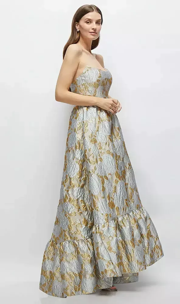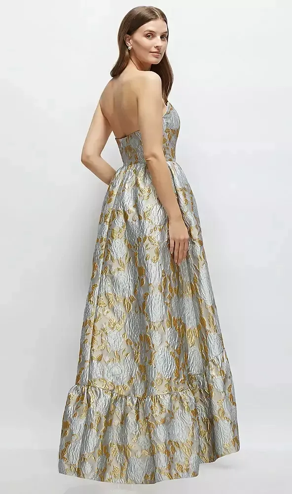 Crafted from a textured, floral gold leaf brocade fabric, this high-low dress embodies luxury with a romantic twist. Its strapless boned bodice showcases a chic cat-eye neckline that's all about sleek lines and major allure. The shirred skirt is finished off with a deep ruffle-trimmed high-low hem, making it a dream for those who love a bit of drama in their step. Whether it's a garden party or a swanky evening event, this dress will turn heads with its understated glam.